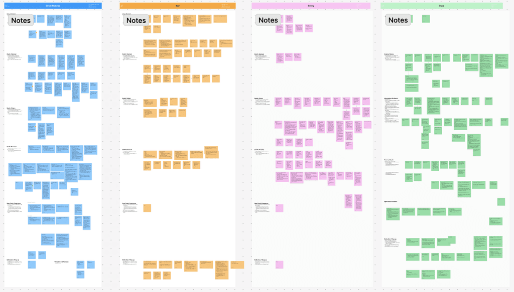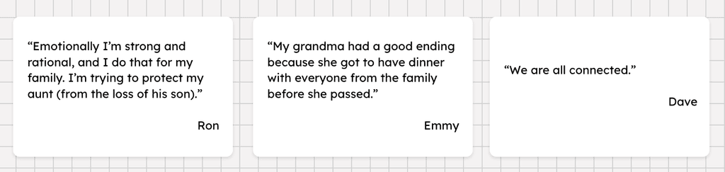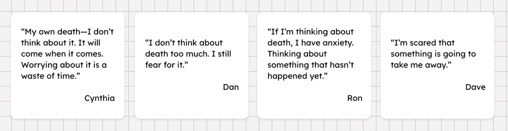 We intentionally chose to conduct interviews in participants’ homes. Sitting down with them face-to-face in their own space helped build trust and made it easier to connect, which allowed for more open, vulnerable conversations around the sensitive topic of death. It also allowed us to observe subtle environmental clues —photos, objects, or how they talked about things—that offered deeper insight into their relationship with loss.