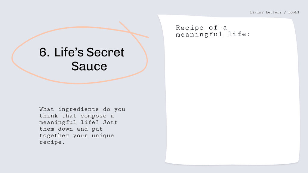 The workbook contains creative prompts designed to help users reflect on their life’s values and meaningful moments.
