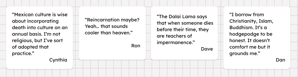 None of the people we talked to considered themselves religious. But when they spoke about death, they often pulled from different beliefs and practices—sometimes mixing things together without even realizing it. Their views felt personal, patchworked, and open to new ideas.