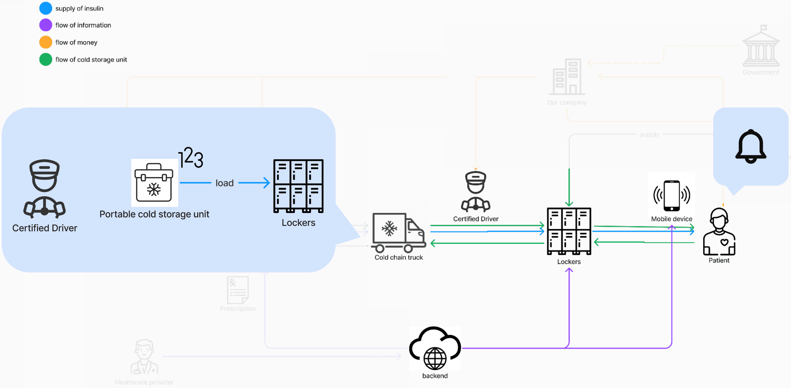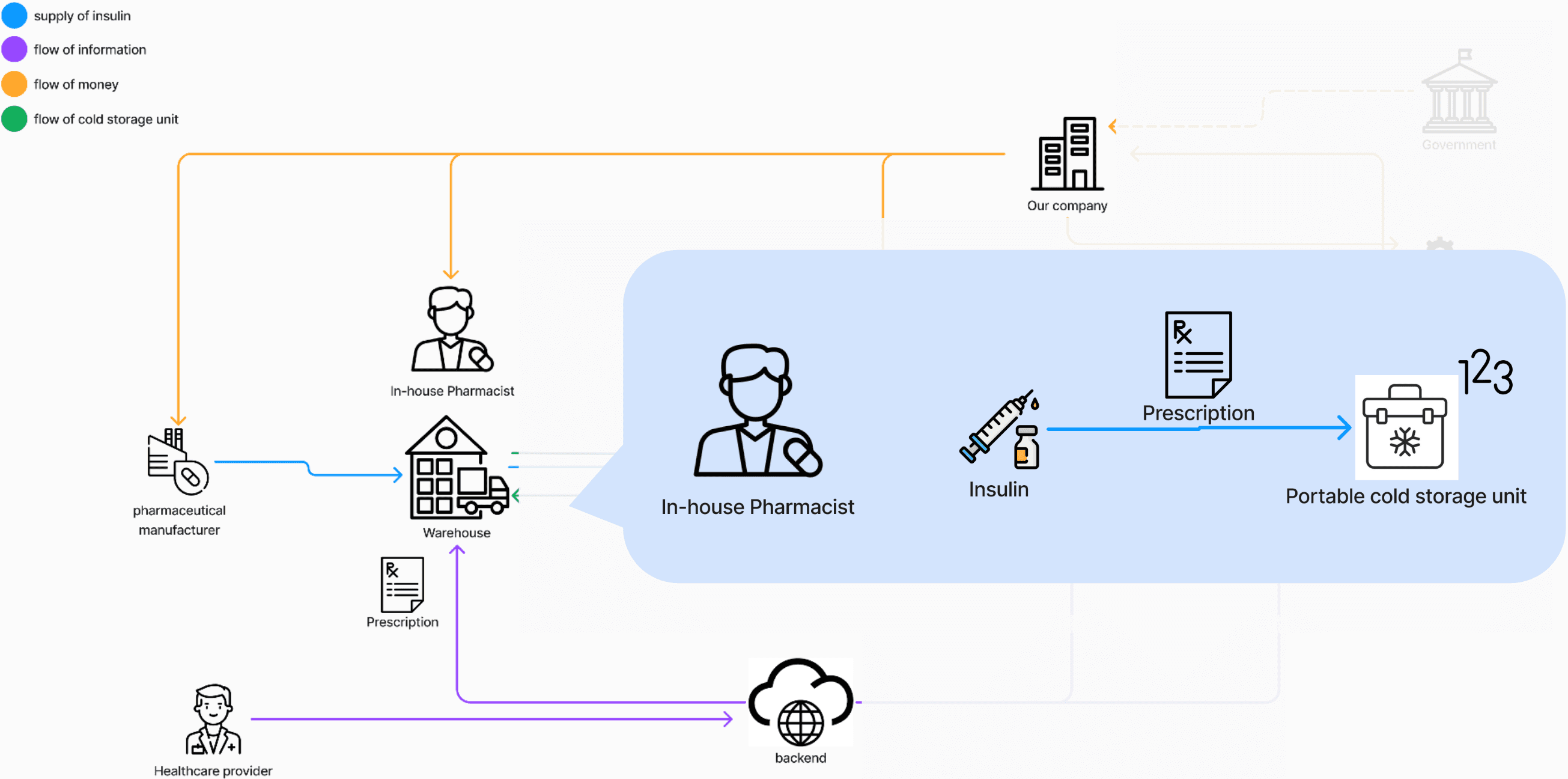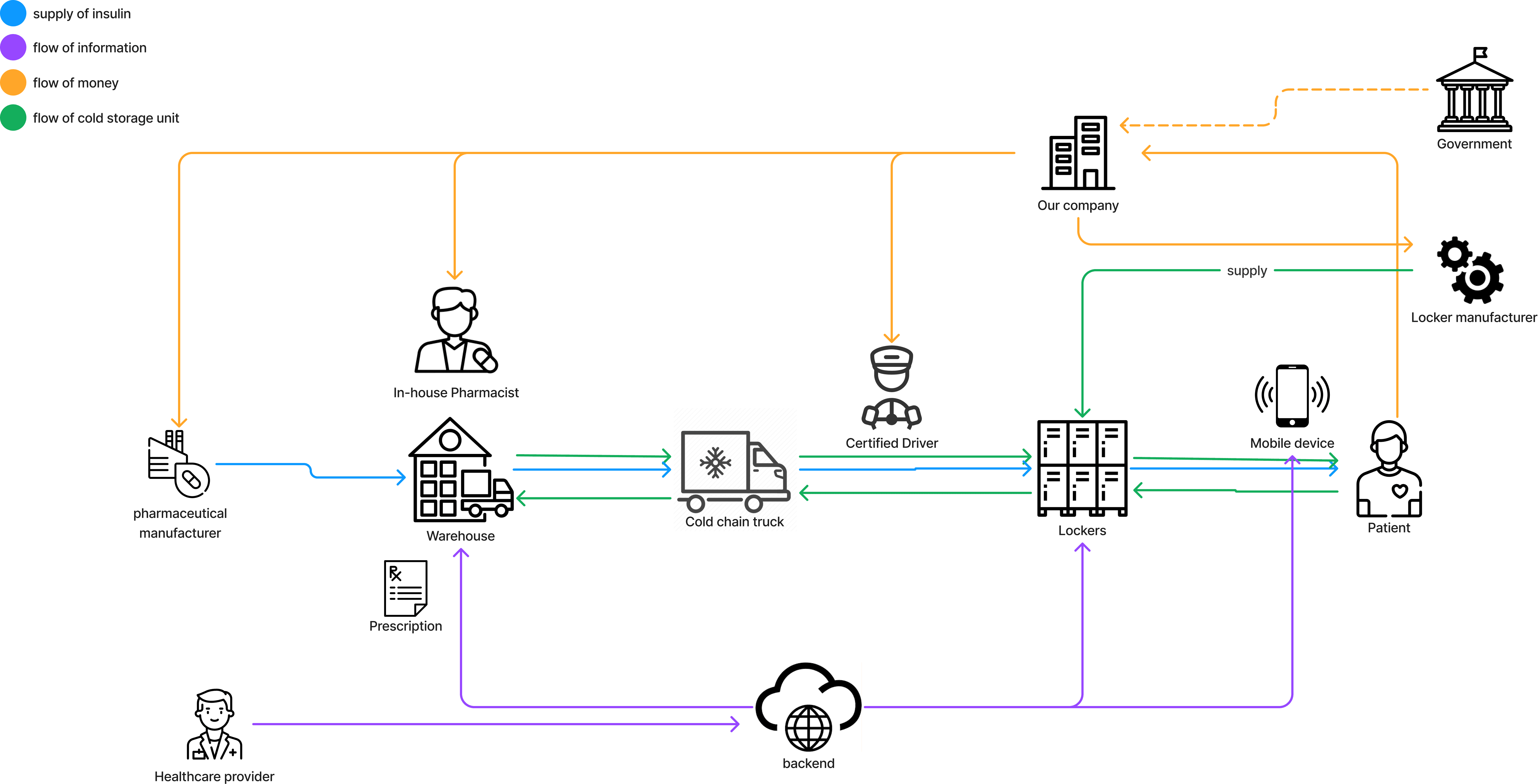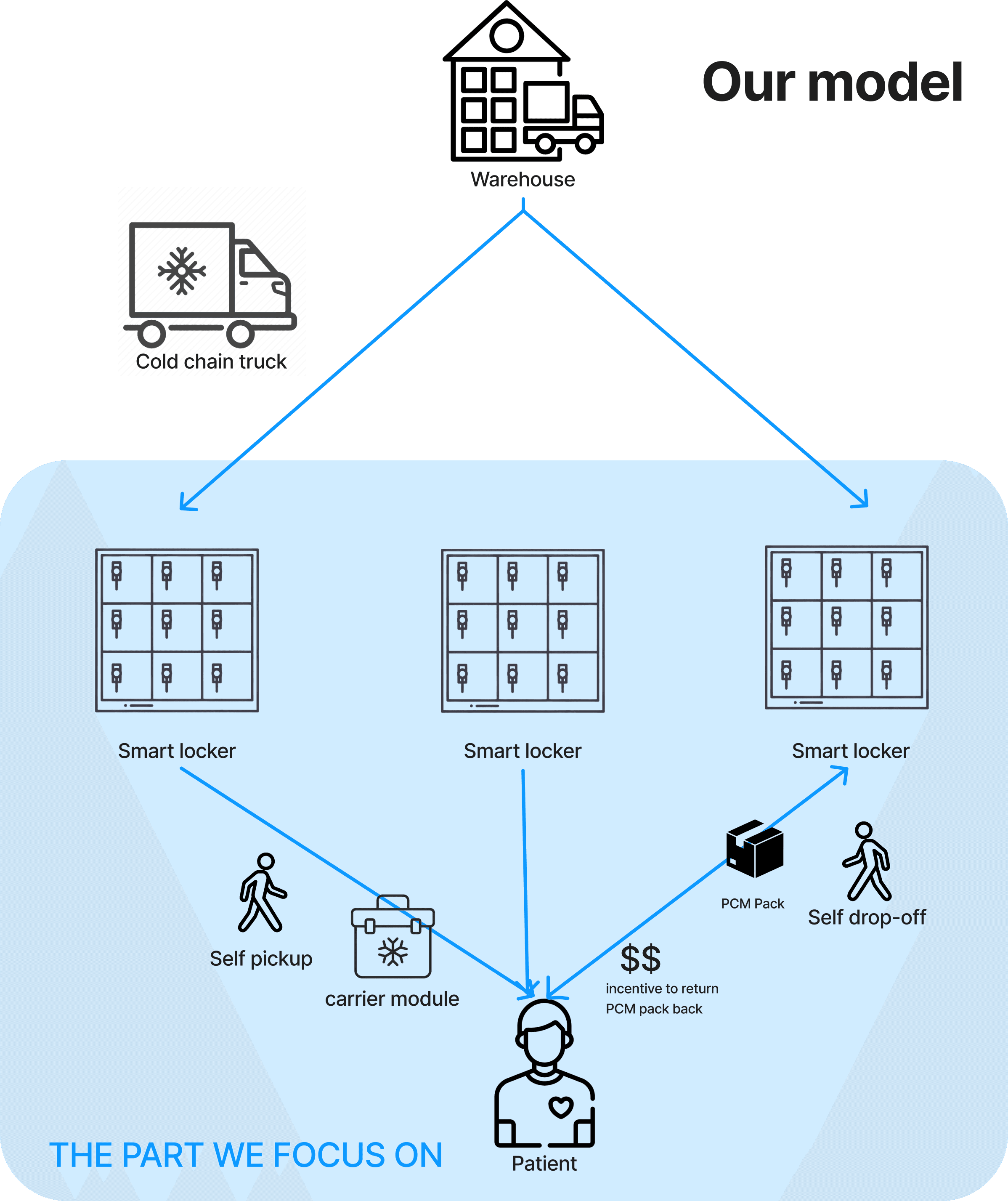 Our model flattens the hierarchy by routing temperature-controlled shipments directly from the warehouse into neighborhood smart lockers. This streamlined flow eliminates an entire distribution tier, minimizes handling risk, and offers patients convenient, cost-effective access to vital medications right in their community.