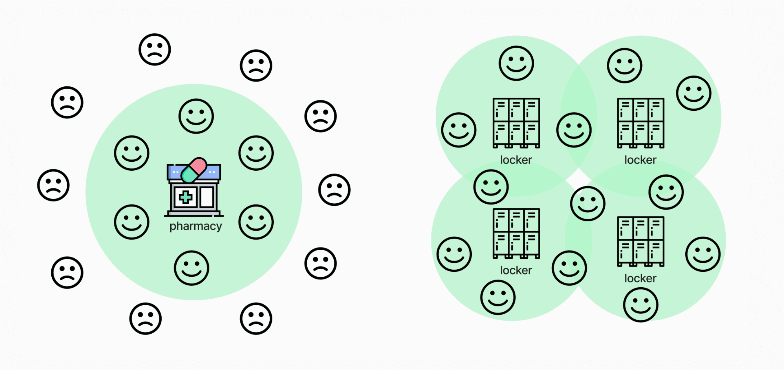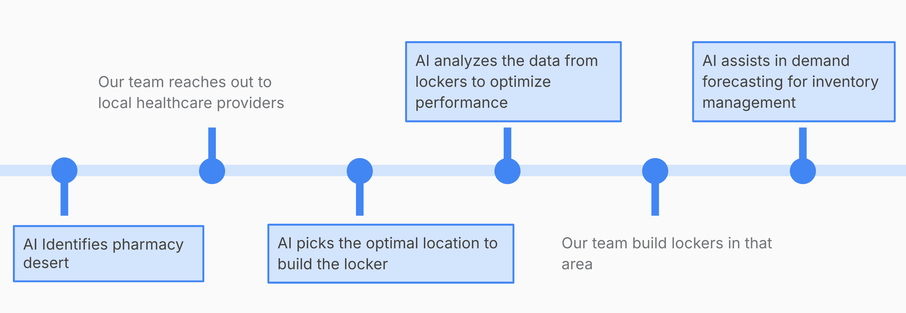 By deploying smart lockers—compact, mobile pharmacy units—throughout neighborhoods, we expand access and eliminate the last-mile hurdle.