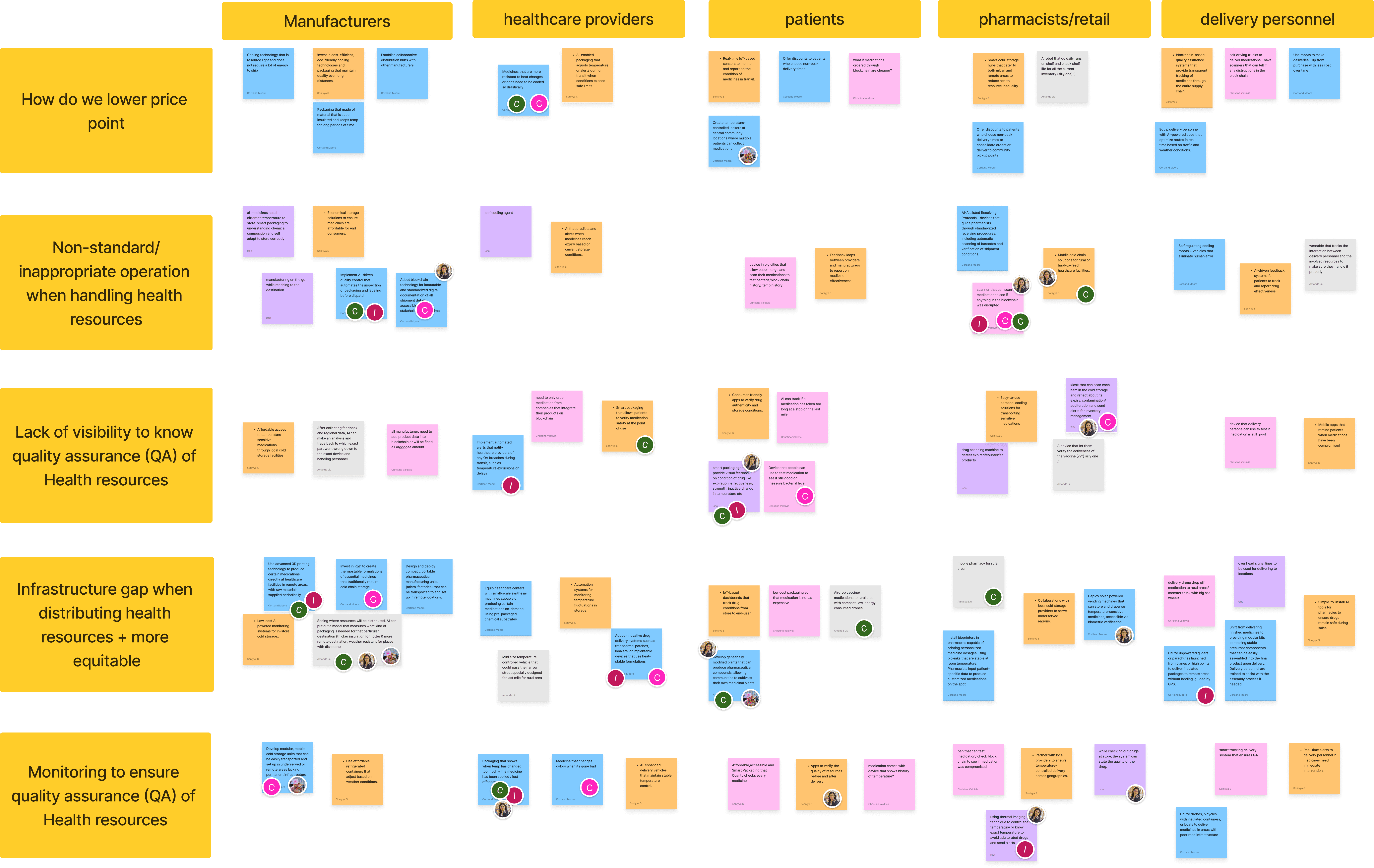 Our team break down the HMW statement into 5 categories (y axis), then inspect each from 5 user types (x axis), resulting in 5x5 = 25 problem spaces. Under each problem space, we brainstormed some ideas.