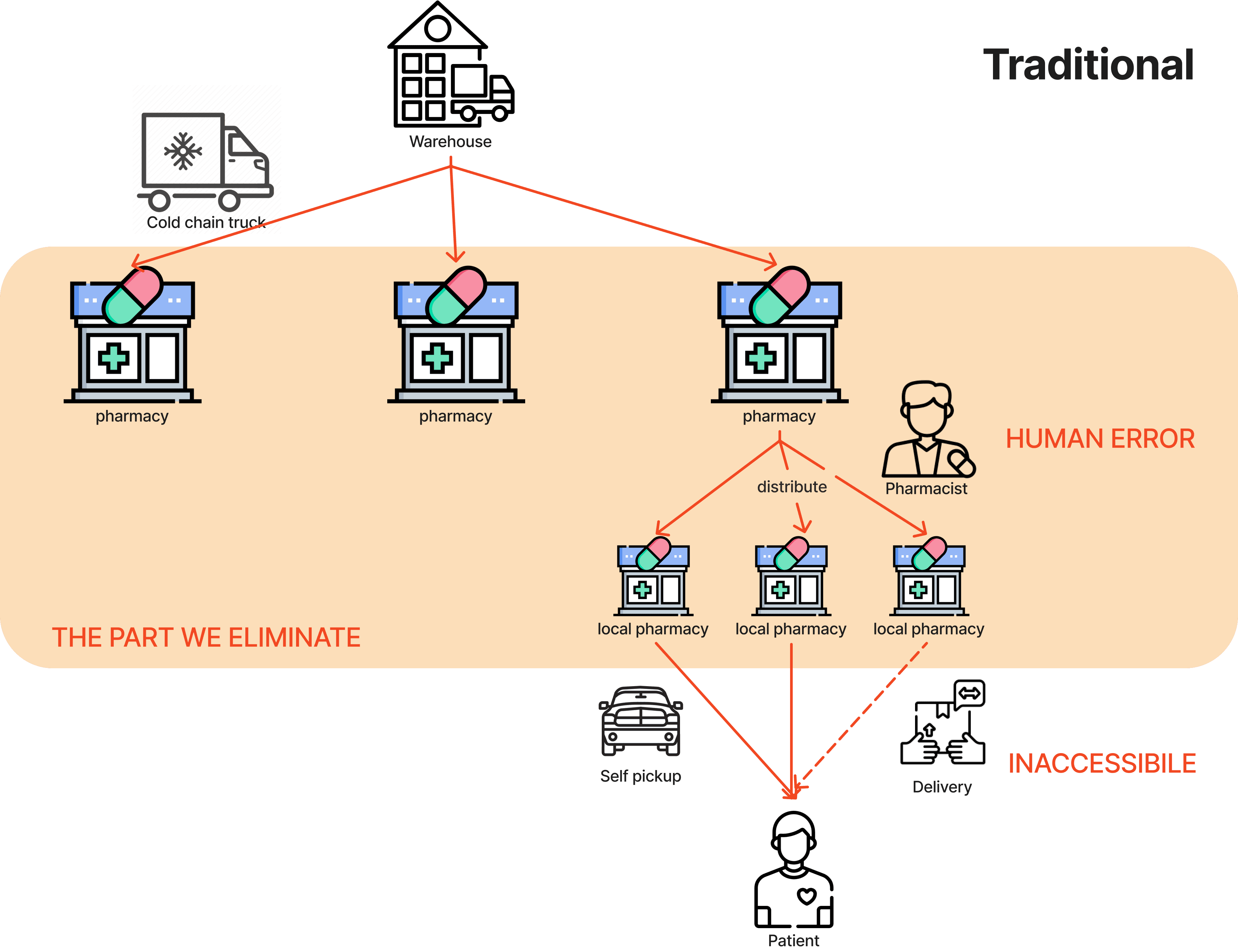 This layered structure not only introduces opportunities for human error in temperature control and handling, but also thrusts patients into the “last-mile” dilemma: they must either travel to pick up medications (often inaccessible in rural areas) or pay premium delivery fees.