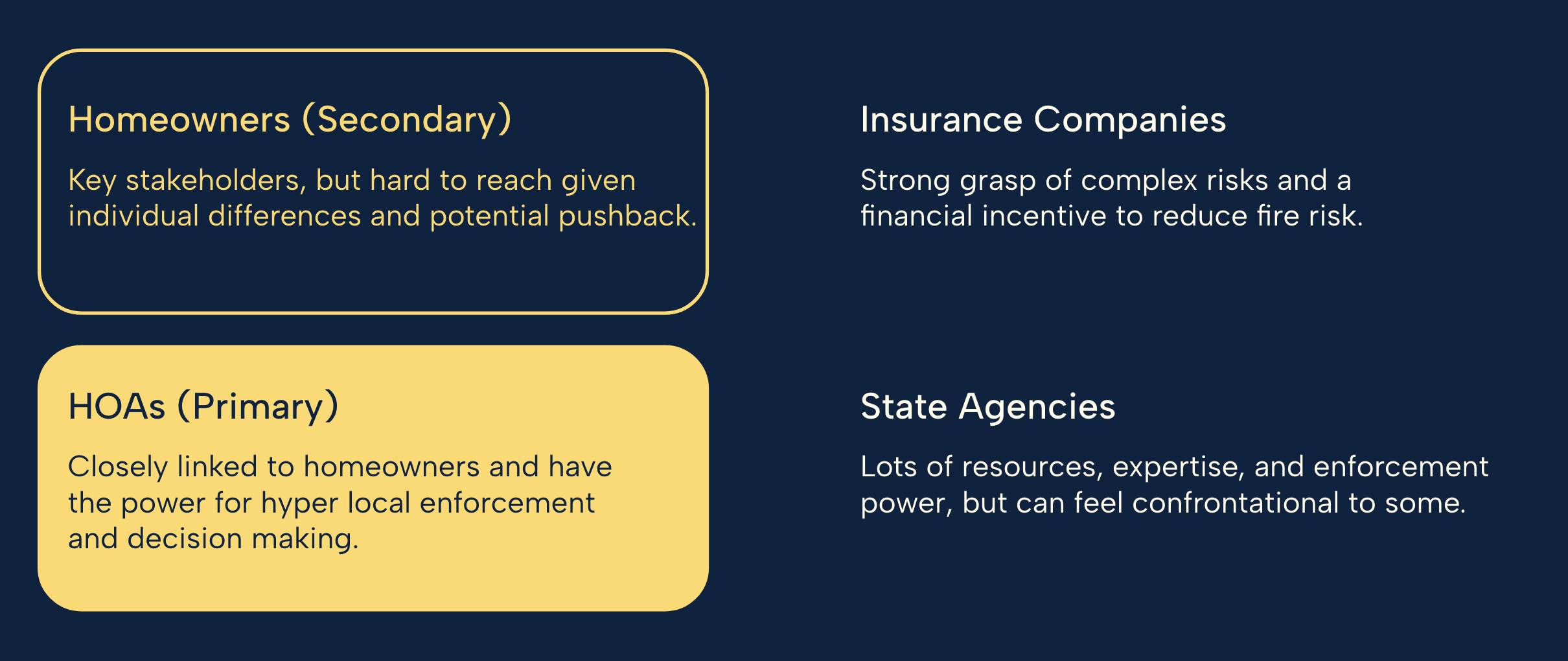 To understand what this would require in practice, we conducted in-depth interviews with HOA leaders and wildfire experts to uncover the real barriers preventing action on the ground.