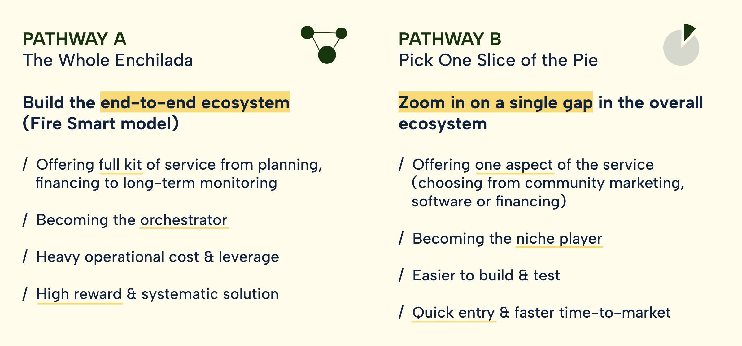 Pathway A leans into system orchestration, building or joining a full end-to-end ecosystem capable of coordinating planning, financing, execution, and long-term monitoring.