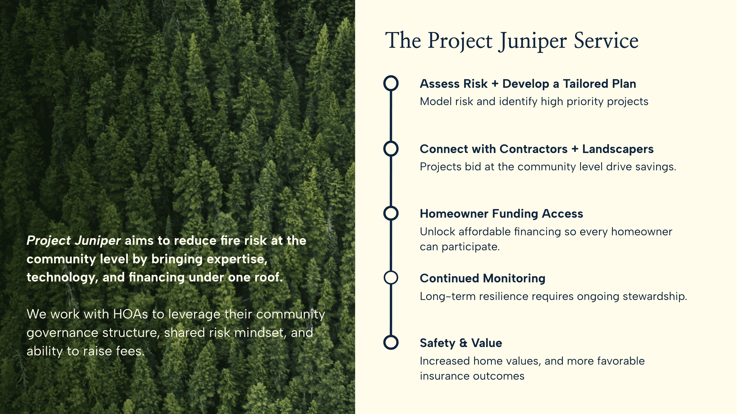 We seek to enable HOAs to systematically reduce wildfire risk by aligning homeowners, services, and incentives into a scalable, self-sustaining model.